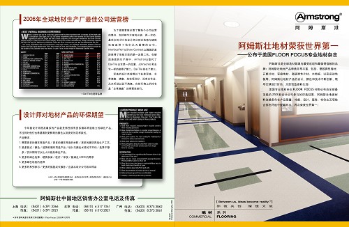 在9月份,地材市场部制作了新一期的世界第一宣传单页.美国的FLOOR FOCUS杂志作为一本业内知名的专业地材杂志,每年进行一项评比.会交由全球最顶级的250家设计公司参与地材产品的综合排名.它会从五个方面:质量,性能,设计,服务,性价比入手.来评选每一年度的世界第一地材品牌.阿姆斯壮连续好几年都有幸参与了这份杂志每年的评选,并且每年都在相关的评比中胜出.成为全球最受欢迎的弹性地材及硬质表面地材生产商.